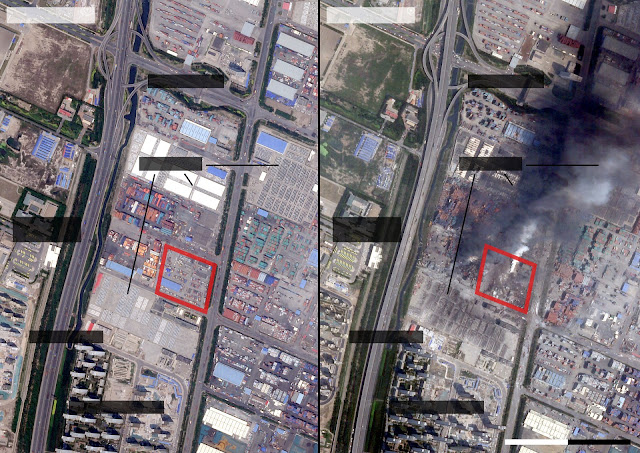 At this point there are many theories and not much evidence to work with, but the explosion size and secondary magnitude does seem to suggest something more then a warehouse fire. And then there's this before and after shot, which from my point of view doesn't seem to have a warehouse at the epicenter. What do you think?]